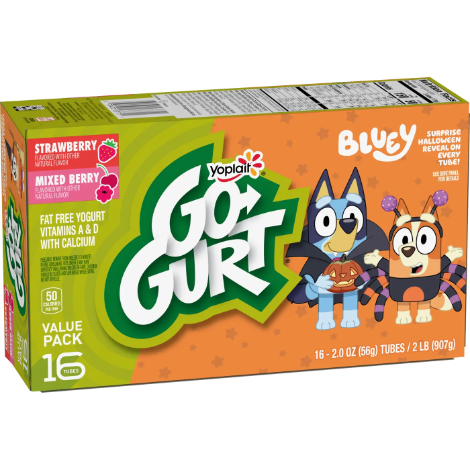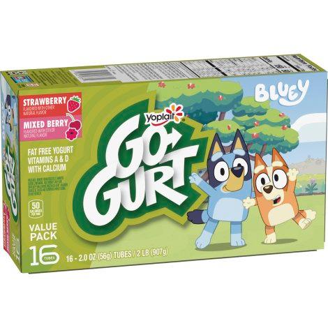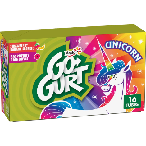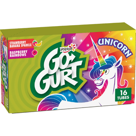 - CONTAINS: One 32 oz Variety Pack of Yoplait Go-GURT Unicorn Strawberry Banana Sparkle Flavored and Raspberry Rainbows Flavored Fat Free Yogurt; Sixteen 2 oz yogurt tubes total