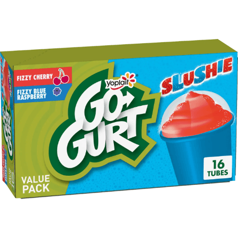 - CONTAINS: One 32 oz Variety Pack of Yoplait Go-GURT Slushie Fizzy Cherry Flavored and Blue Raspberry Flavored Fat Free Yogurt Style Snack; Sixteen 2 oz tubes total