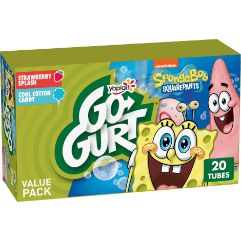 - CONTAINS: One 40 oz Variety Pack of Yoplait Go-GURT SpongeBob SquarePants Strawberry Splash Flavored and Cool Cotton Candy Flavored Fat Free Yogurt; Twenty 2 oz yogurt tubes total