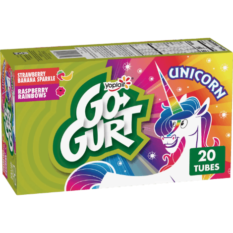 - CONTAINS: One 40 oz Variety Pack of Yoplait Go-GURT Unicorn Strawberry Banana Sparkle Flavored and Raspberry Rainbows Flavored Fat Free Yogurt; Twenty 2 oz yogurt tubes total