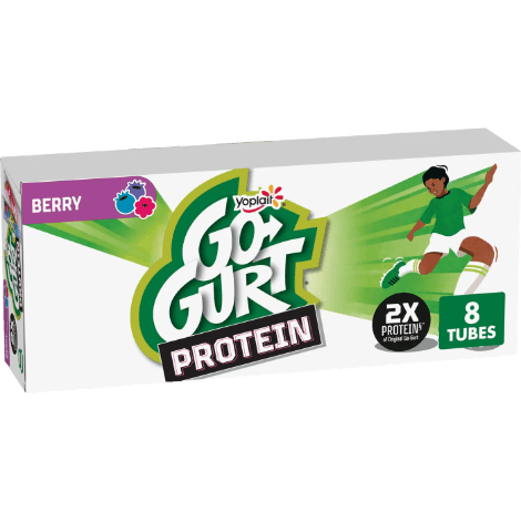 Grab the kids protein snack that serves up flavor and fun on the run! Go-GURT Protein Berry Flavored Low Fat Yogurt Tubes have two times the protein of Original Go-GURT.* These low fat yogurt tubes are gluten free and every serving provides vitamins A and D, with calcium. Each kids snack tube has 50 calories, live and active cultures, and no high fructose corn syrup. These easy-to-open tubes are perfect as part of breakfast, lunch snack, or an after school treat. Want to mix things up? Instead of storing them in the fridge, toss them in the freezer following package directions for a cool, creamy delight. For best product quality, do not refreeze after thawing. No matter how you enjoy Go-GURT Protein, Yoplait brings goodness to everyday moments, one serving of yum at a time. *Contains 10% more of the daily value for protein per serving than Original Go-GURT; Go-GURT Protein contains 12g protein per serving and 4g per tube; Original Go-GURT contains 6g protein per serving and 2g per tube.