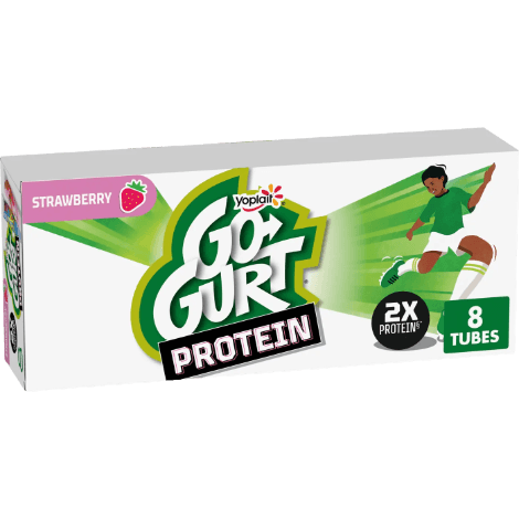 Grab the kids protein snack that serves up flavor and fun on the run! Go-GURT Protein Strawberry Flavored Low Fat Yogurt Tubes have two times the protein of Original Go-GURT.* These low fat yogurt tubes are gluten free and every serving provides vitamins A and D, with calcium. Each kids snack tube has 50 calories, live and active cultures, and no high fructose corn syrup. These easy-to-open tubes are perfect as part of breakfast, lunch snack, or an after school treat. Want to mix things up? Instead of storing them in the fridge, toss them in the freezer following package directions for a cool, creamy delight. For best product quality, do not refreeze after thawing. No matter how you enjoy Go-GURT Protein, Yoplait brings goodness to everyday moments, one serving of yum at a time. *Contains 10% more of the daily value for protein per serving than Original Go-GURT; Go-GURT Protein contains 12g protein per serving and 4g per tube; Original Go-GURT contains 6g protein per serving and 2g per tube.