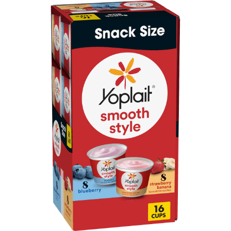 - CONTAINS: One 72 oz Variety Pack of Yoplait Strawberry and Harvest Peach Low Fat Yogurt; 6 yogurt cups of each flavor; 12 yogurt cups total