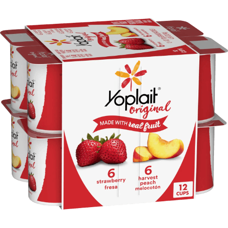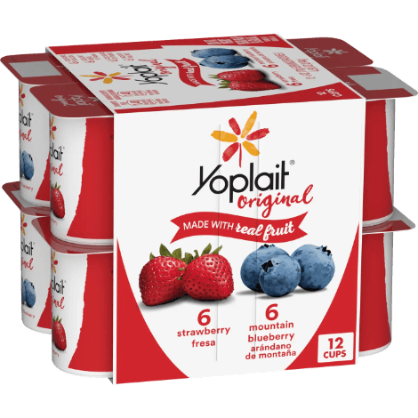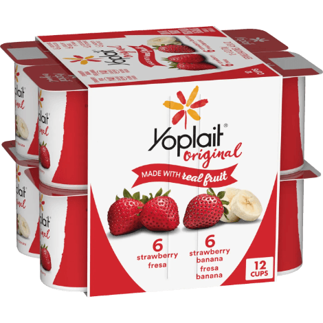 - CONTAINS: One 72 oz Variety Pack of Yoplait Strawberry and Strawberry Banana Low Fat Yogurt; 6 yogurt cups of each flavor; 12 yogurt cups total