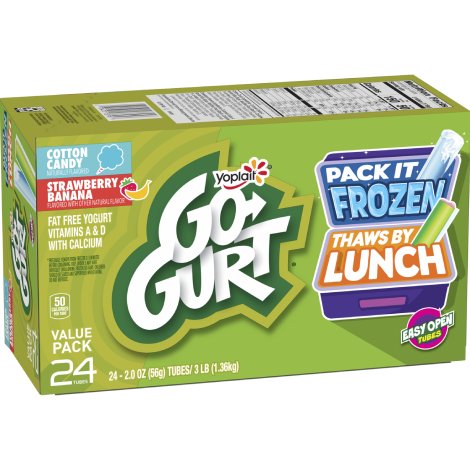 Enjoy fun and delicious kids yogurt with Simply Go-GURT Mixed Berry Flavored and Strawberry Banana Flavored Kids Low Fat Yogurt Tubes. The easy to open yogurt tubes are a convenient on the go snack or part of an easy gluten free breakfast. Pack frozen for school lunch box snacks. Portioned in two ounce yogurt tubes, this yogurt variety pack contains 4 Mixed Berry flavored and 4 Strawberry Banana flavored yogurt individual snacks. Yoplait Go-GURT is a snack made with live and active yogurt cultures. Each kids yogurt tube contains no high fructose corn syrup and no colors from artificial sources. Every serving contains vitamins A and D and is a good source of calcium. Store in the refrigerator and keep cold until you're ready to enjoy. For best product quality, do not refreeze after thawing. Yoplait brings goodness to everyday moments, one serving of yum at a time.