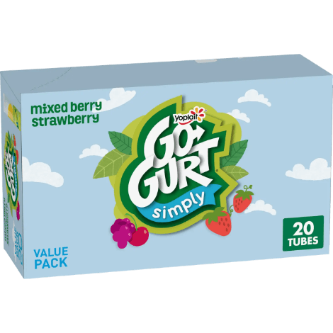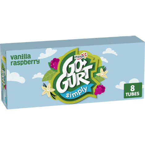 Enjoy fun and delicious kids yogurt with Simply Go-GURT Vanilla Flavored and Raspberry Flavored Kids Low Fat Yogurt Tubes. These easy to open yogurt tubes are a convenient on the go snack or part of an easy gluten free breakfast. Pack frozen for school lunch box snacks that thaw by lunchtime. Portioned in 2 oz yogurt tubes, this yogurt variety pack contains 4 Vanilla flavored and 4 Raspberry flavored individual yogurt snacks. Yoplait Go-GURT is a snack made with live and active yogurt cultures. Each kids yogurt tube contains no high fructose corn syrup, no added color, and no artificial flavors. Every serving contains vitamins A and D and is a good source of calcium. Store in the refrigerator and keep cold until you're ready to enjoy. For best product quality, do not refreeze after thawing. Yoplait brings goodness to everyday moments, one serving of yum at a time.